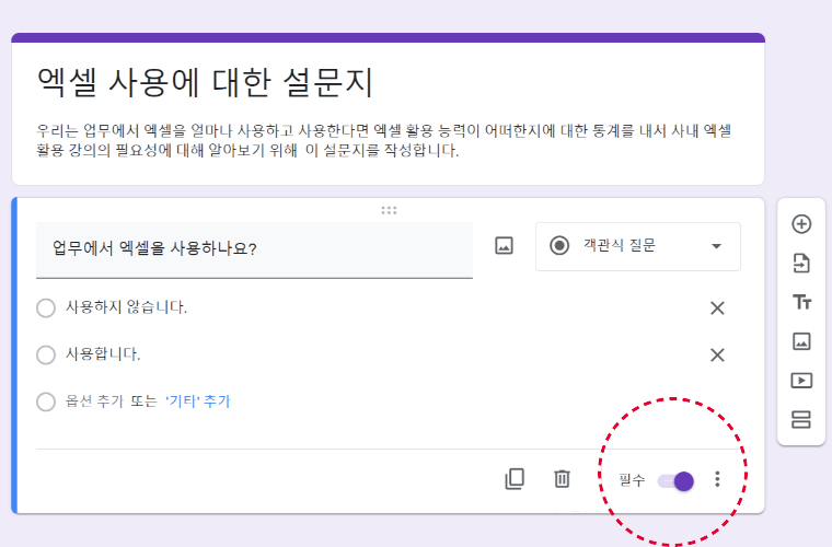 8. 반드시 답변을 받아야 할 항목이 있다면 질문 창 하단 오른쪽에 '필수' 항목을 선택합니다. 참여자가 이 질문에 답변하지 않으면 다음 페이지로 넘어가지 않거나 제출할 수 없습니다.